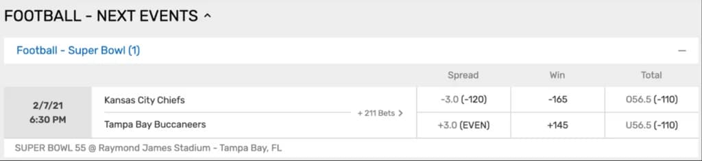 With these Super Bowl odds, you can also see that the Bucs spread is listed as +3.0 (EVEN). This means that you get “even money” on your bet if you win. Here, you bet $100 to win $100. Nice and straightforward, like a run up the middle.