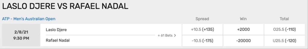 These tennis odds show the moneyline in the “Win” column. This is a pretty lopsided matchup, with Rafael Nadal heavily favored over Laslo Djere. Because Nadal is expected to win, the moneyline reflects this. Betting $20,000 on him wins you $100.