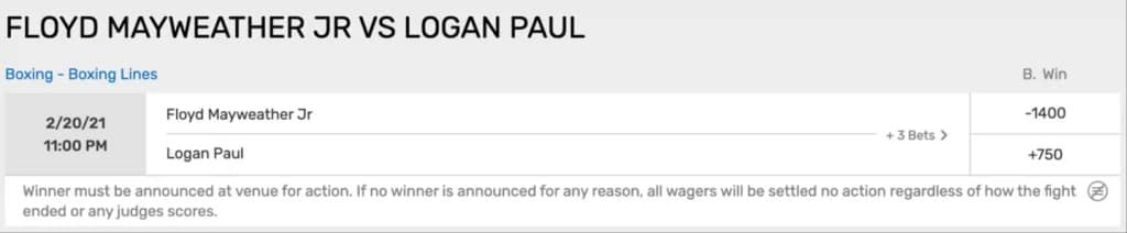 Here we have the ridiculous matchup of Floyd Mayweather, Jr. taking on YouTuber-turned-boxer Logan Paul. The moneyline has Floyd as a heavy favorite at -1400. This means that you need to wager $1,400 dollars to win $100 with these lines. Logan Paul is a big underdog at +750. If he manages to pull off a win, though, bets of $100 win a whopping $750.