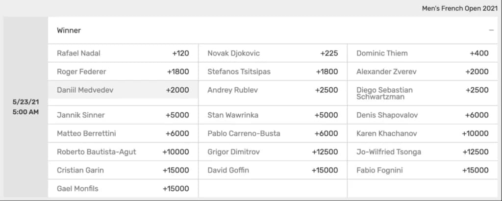 For example, here are the Bovada tennis betting odds for the 2021 French Open: